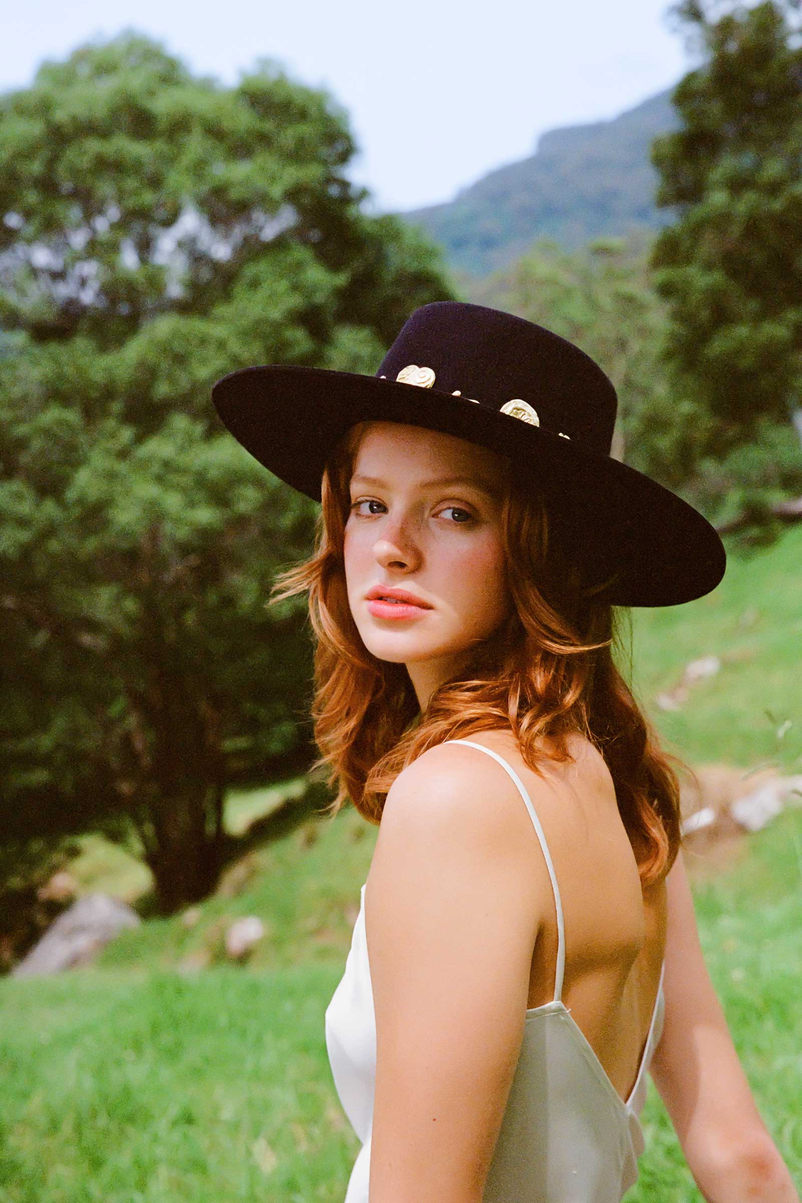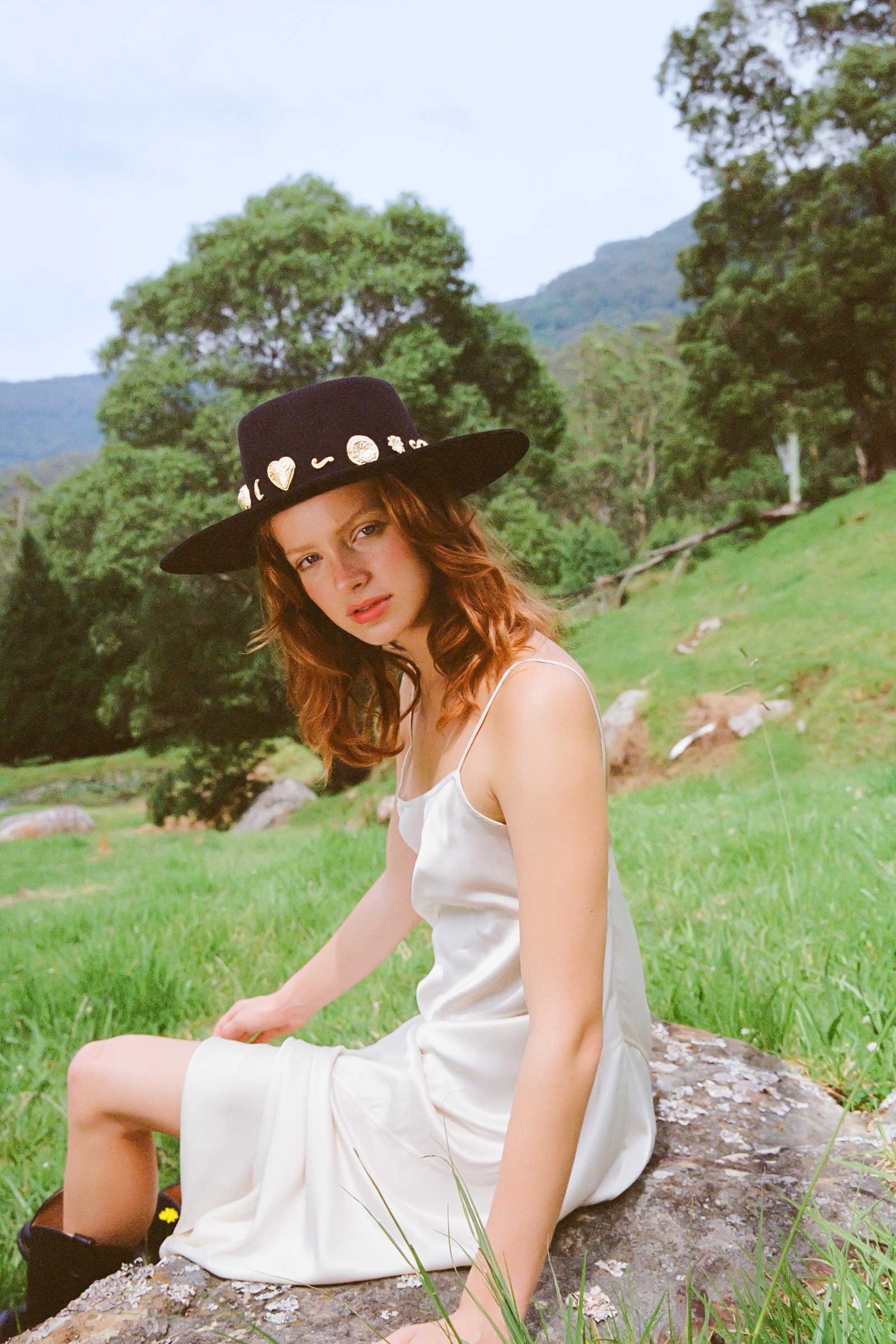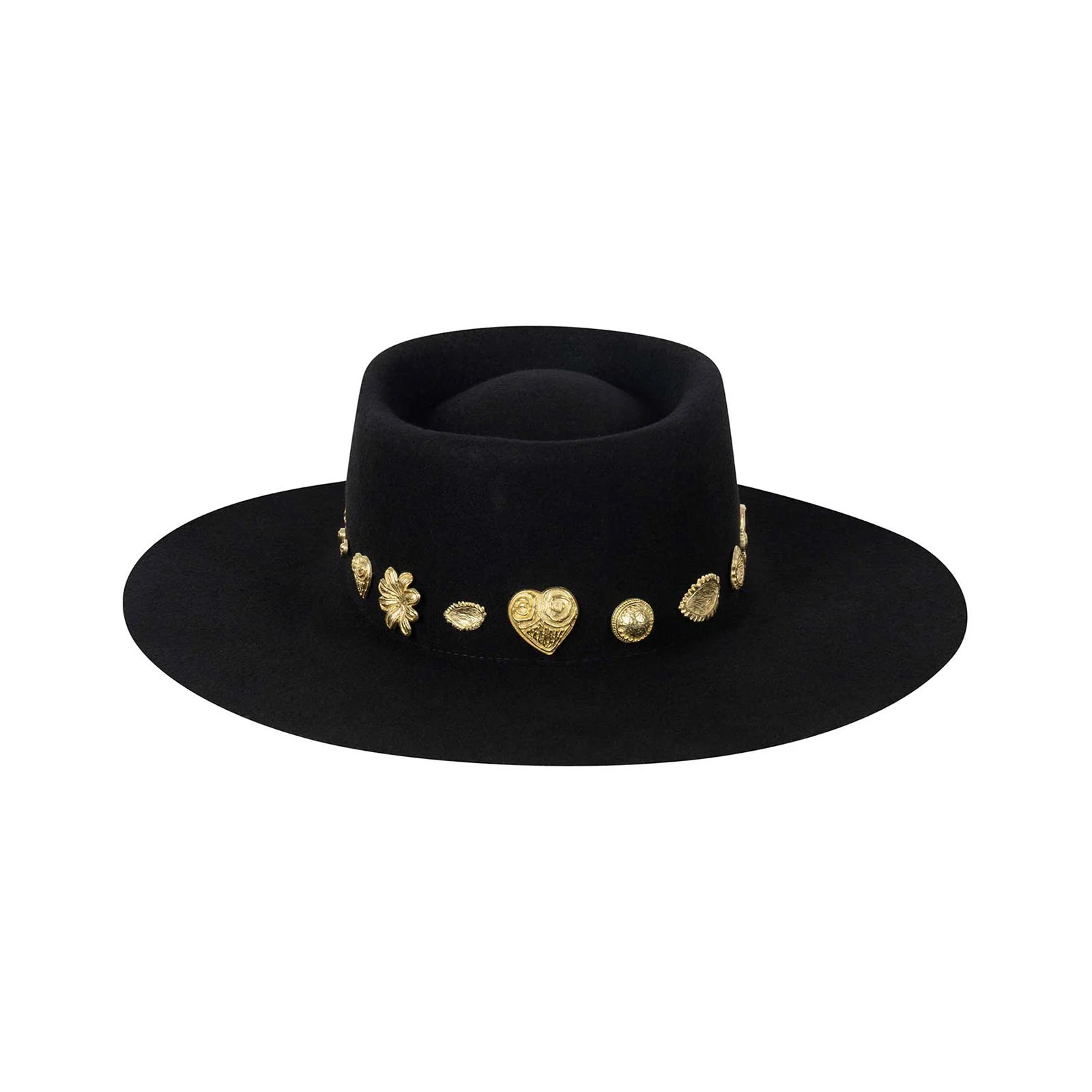 The Cosmic Boater - featuring our classic black dipped crown boater silhouette with custom made brushed gold finish Lack of Color galaxy conchos.