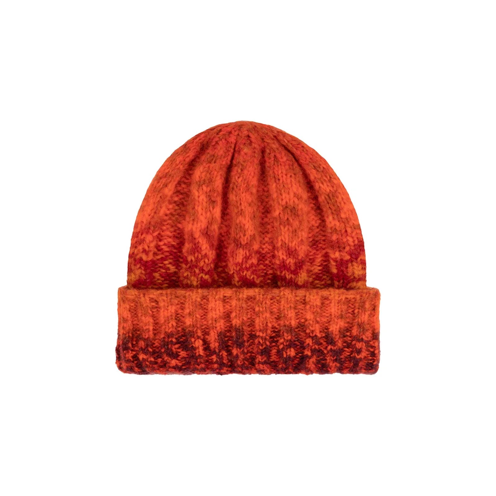 Bold and bright, this variegated rib detail beanie is made from an alpaca and wool blend printed Italian yarn. Featuring a deep double turnback cuff with wide rib detail, this is the style to make you stand out this winter.