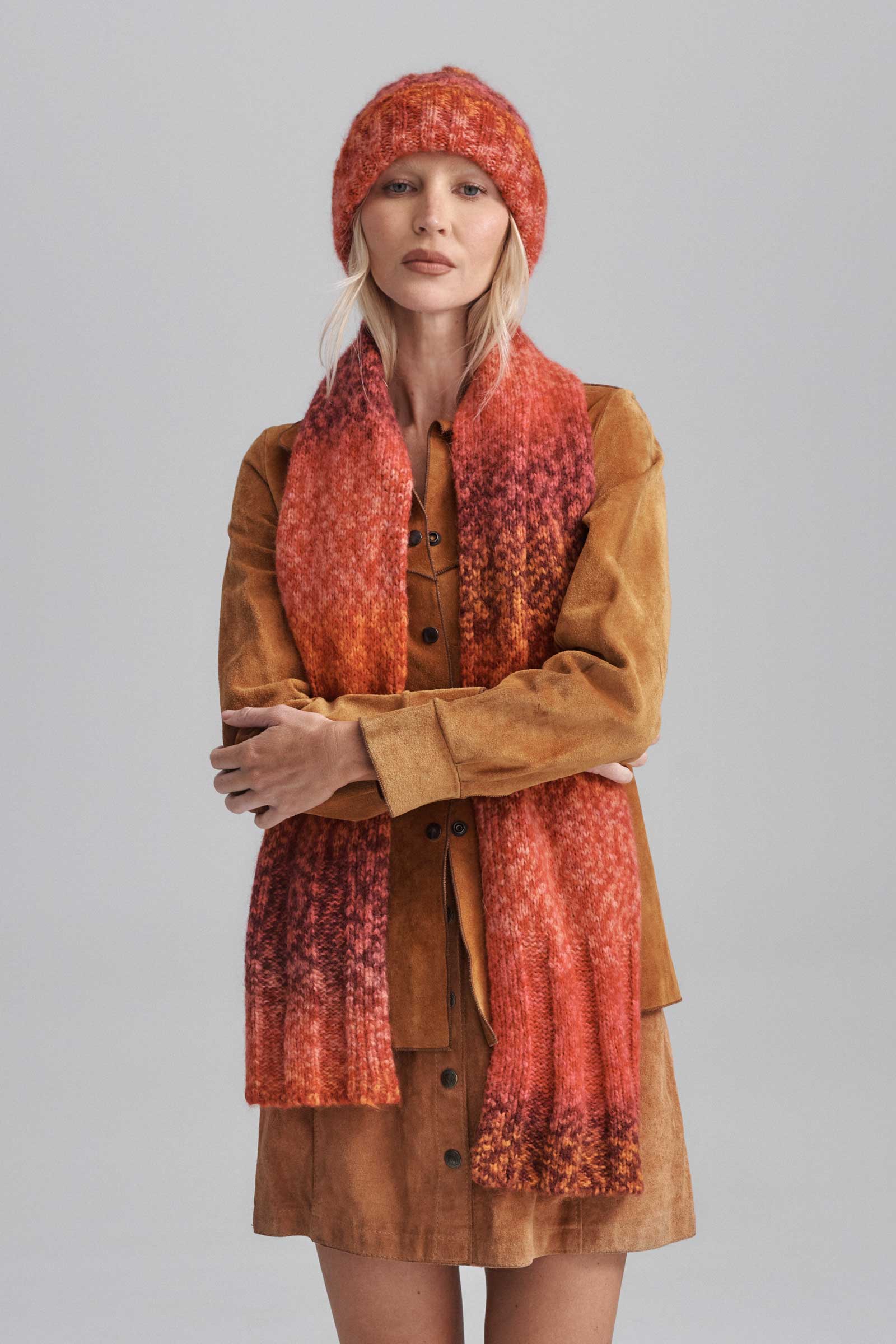 Bold and bright, this variegated rib detail scarf is made from an alpaca and wool blend printed Italian yarn. Featuring wide rib detail, snuggle up stylishly this winter.