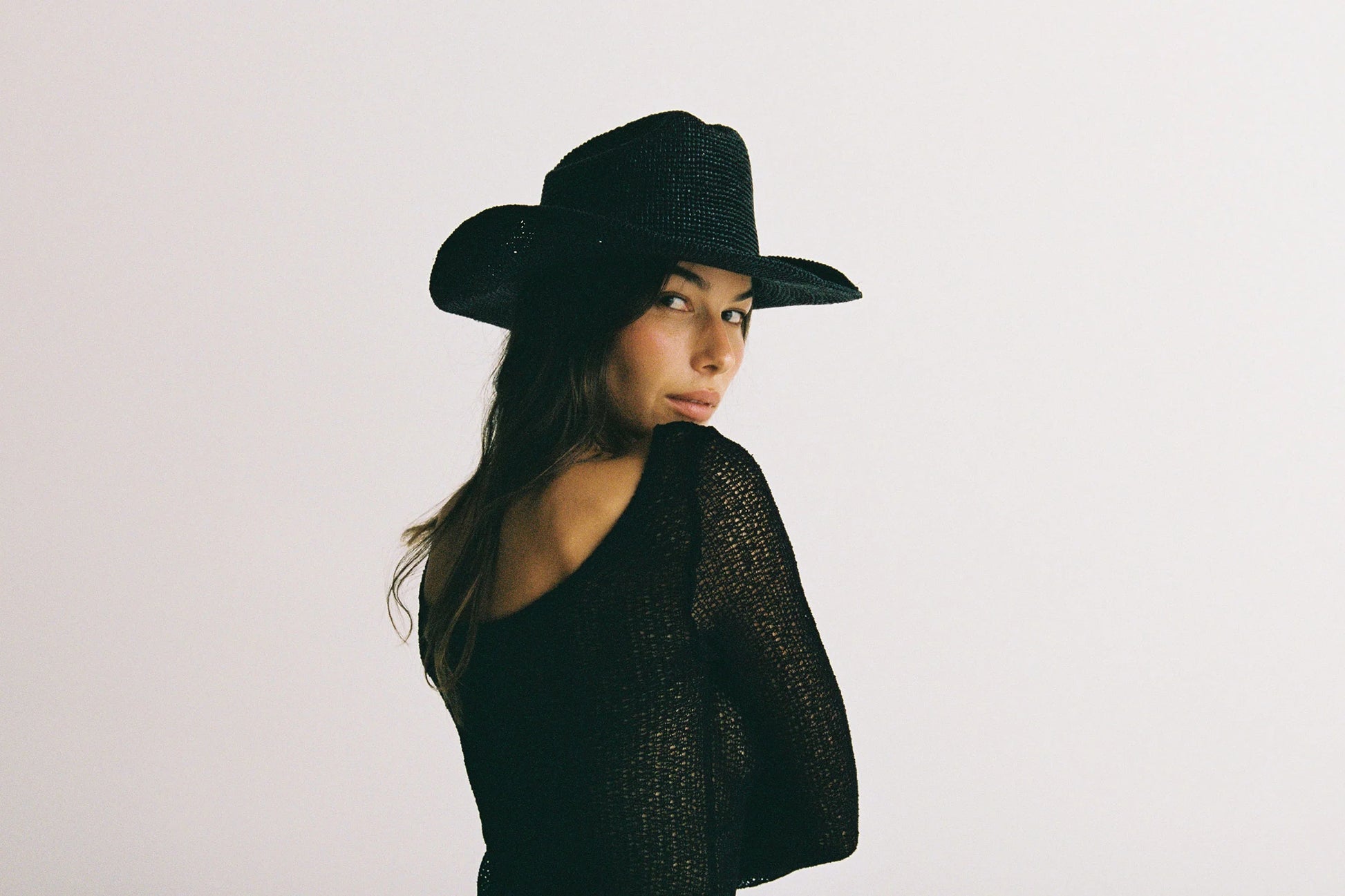 How to say you’re here for the good vibes without saying you’re here for the good vibes.. For the daring and the spicy at heart, the new Raffia Cowboy in Noir Chili is crafted from tightly woven raffia straw in a classic western silhouette, featuring premium glass beading with chili accent.