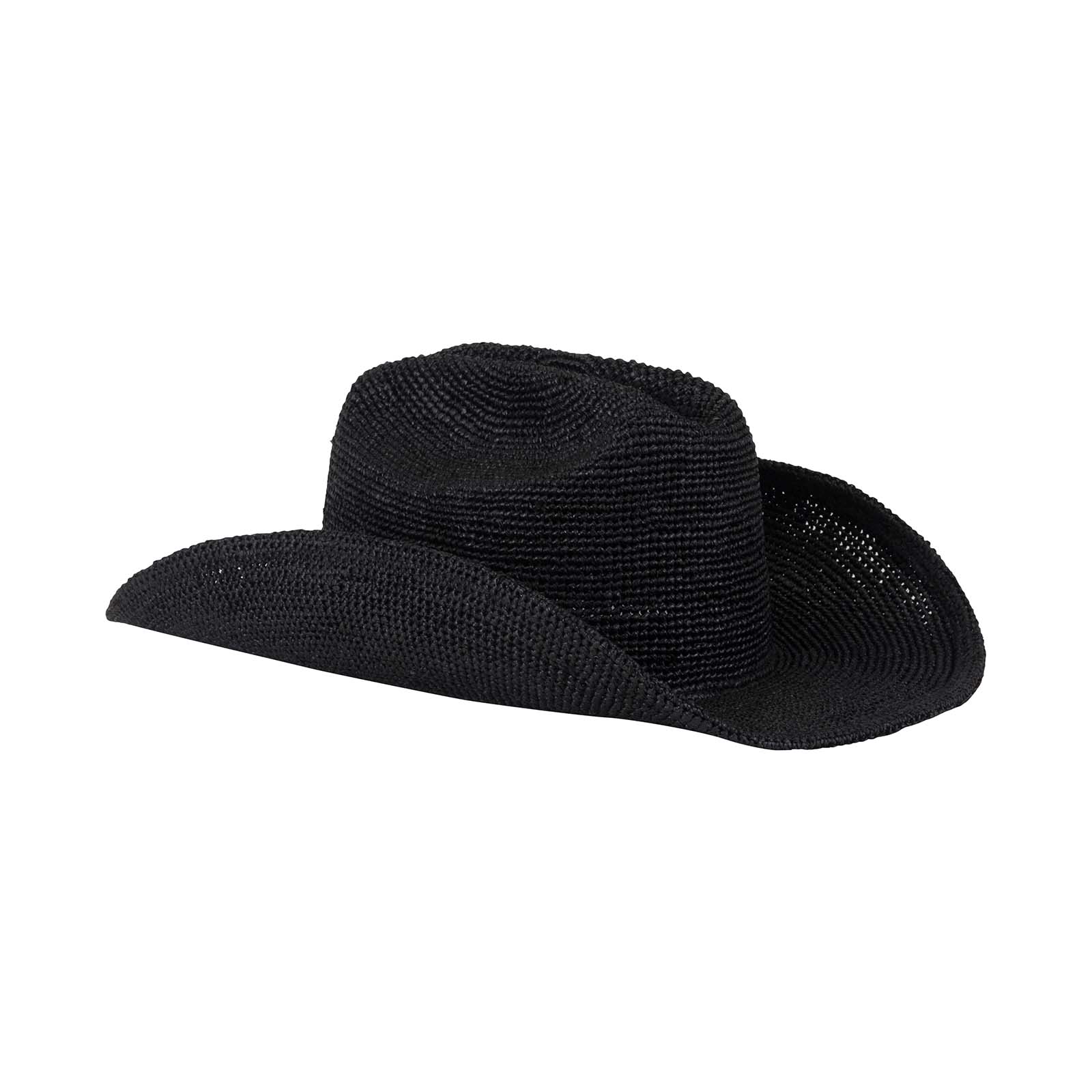 Channel California-cool in our raffia cowboy hat. Crafted from hand crochet black color raffia with a cattleman crown, transition from beach to bar and beyond with ease.