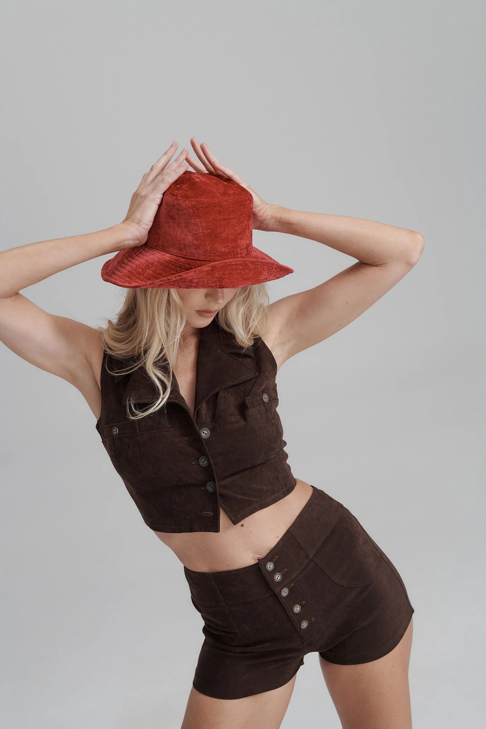 Our winter favorite mid brim bucket, in rich fuchsia color velvet. Wear flipped up for a playful vibe or sloped down for a chilled look. Perfect for your vacay or staycay!