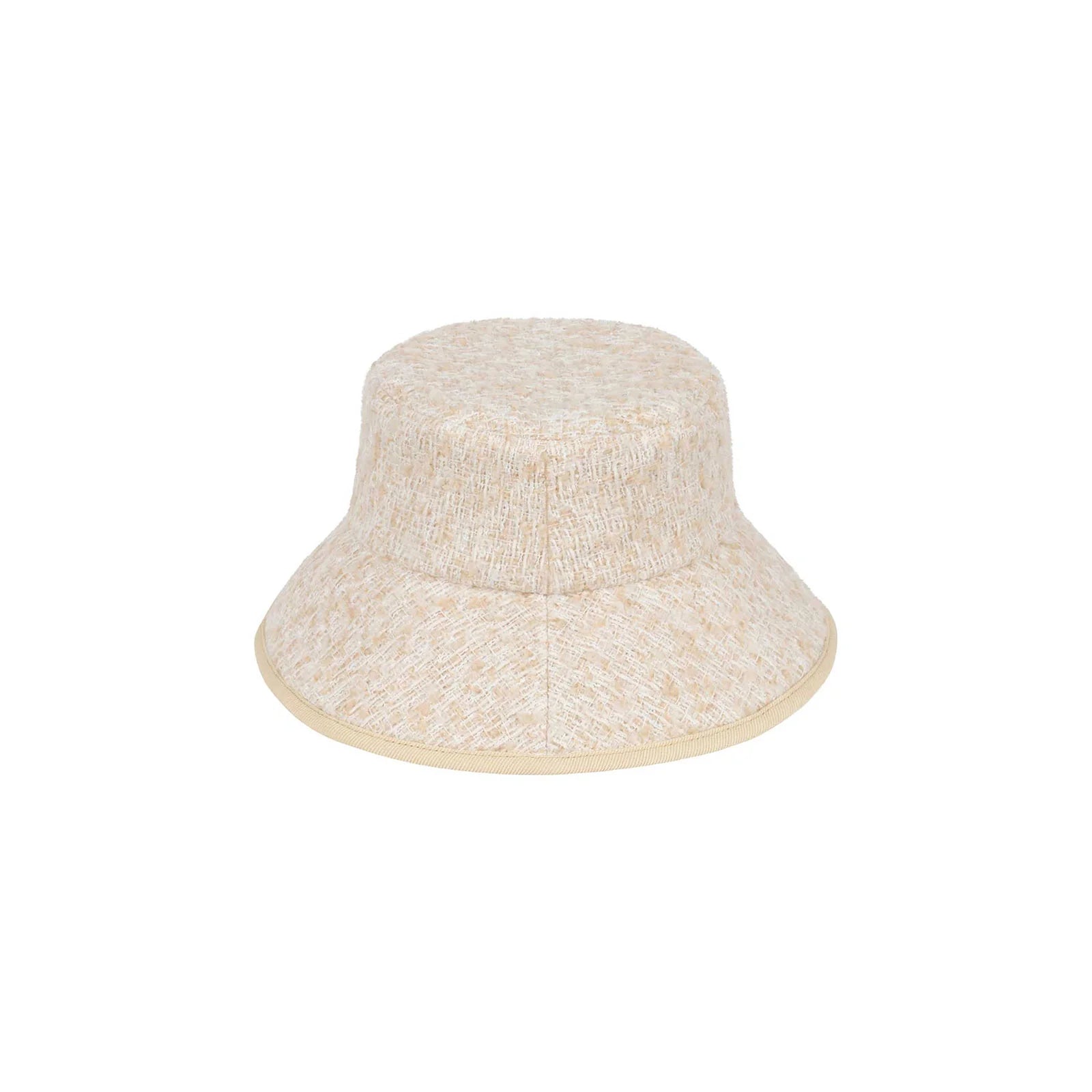 Our classic bucket hat silhouette, now in a mid brim length. Crafted from textural tweed fabric in a melange of ivory and sandy tones, the slub yarn is woven to create each unique piece. Finished with a tonal twill fabric edge bind, this hat will soon become a staple.